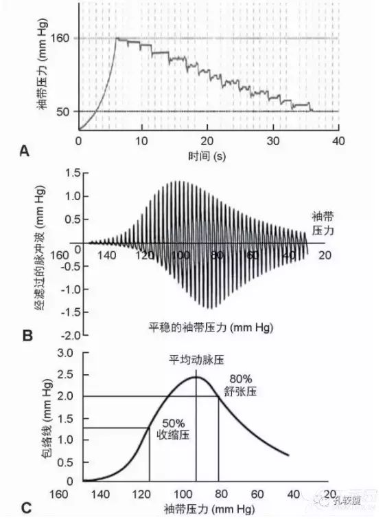 A:袖帶中實際壓力曲線圖,圖中細小的波動爲脈搏波的壓力波;B:經(jīng)過(guò)處理的袖帶壓力與脈沖波幅的關系曲線;C:爲包絡線:依據包絡線可以确定收縮壓和舒張壓。頂峰的壓力爲平均動脈壓,上升至頂峰 50% 處的袖帶壓力爲收縮壓,下降至頂峰壓力 80% 處的袖帶壓力定爲舒張壓。